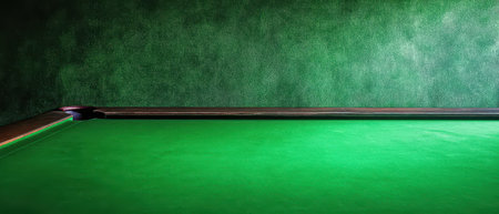 A well maintained green billiards table rests against a dark textured wall. Soft lighting enhances the tables vibrant color and atmosphere.