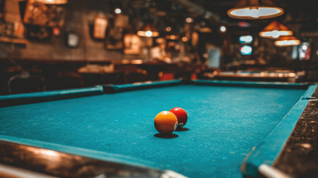 A close interior shot showcases a pristine pool table with a blue eight ball, and well-crafted wooden cue stick. The dim lighting adds to the mood.