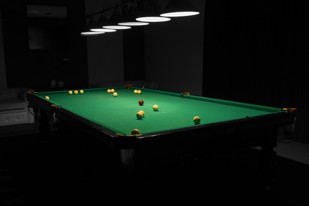 Billiard table with balls in a pub or club, shallow depth of field