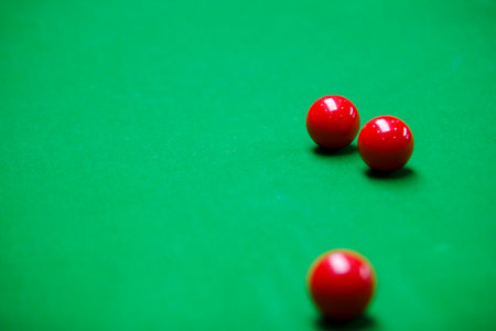 Close-up of red snooker balls on a green table, ready for the next shot. A game of precision, strategy, and skill in a professional billiards setting.