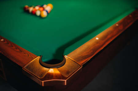 decorative billiard hole and green table with balls in the billiard club.