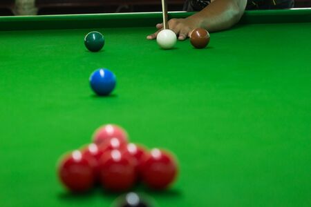 Playing billiard. Billiards balls green billiards table. Billiard sport concept. Pool billiard game.