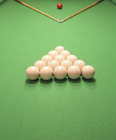 Billiard balls, formed a triangle and two cues, prepared to start the game on the table