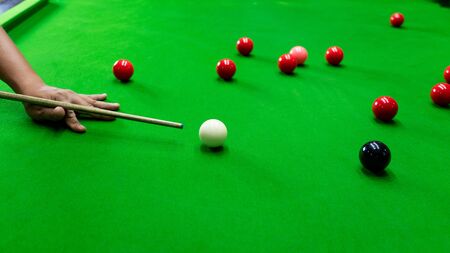 Man's hand and Cue arm playing snooker game or preparing aiming to shoot pool balls on a green billiard table