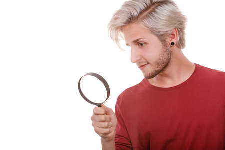 Handsome young man with magnifier, selective focus on eyes. Portrait on a white background.