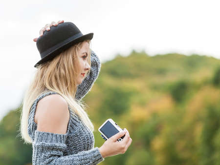 Smiling woman wearing black hat and grey sweater taking pictures using digital camera on outdoor photo session. Female having passion.