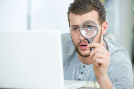 The man is carefully examining something through a magnifying glass. The concept of research and the search for new ideas.
