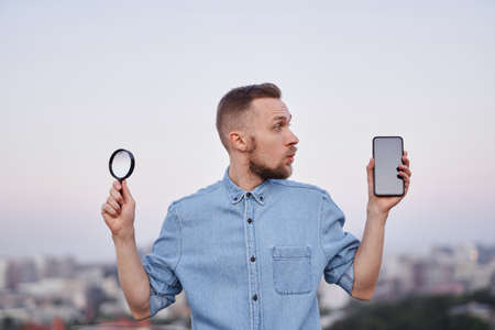 Cute bearded man happy expression looking at camera. Male wearing jeans shirt and hat holding magnifying glass and smartphone in hands at city view as detective, investigator or searching concept