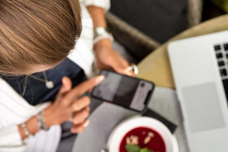 a young beautiful woman is being photographed. photo via phone. the phone is in the hands of a girl. wandering focus.