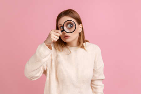 Portrait of funny blond woman standing, holding magnifying glass and looking at camera with big zoom eye, verifying authenticity, wearing white sweater. Indoor studio shot isolated on pink background.