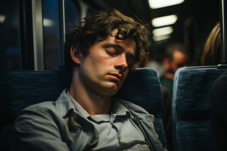Weary young woman catches a moment of rest, sleeping snugly in a vibrant orange scarf on a subway train, oblivious to the bustling world passing by outside the rain-speckled window.