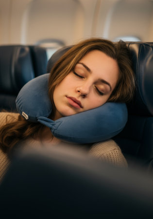 Young woman sleeping on airplane with neck pillow in cozy blue seat.