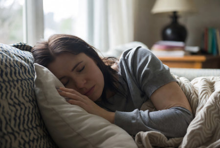 Blonde woman lying in bed with eyes closed, evoking deep relaxation.