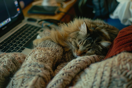 A cat peacefully sleeps on a soft blanket in front of a laptop as someone works, A pet sleeping on a person's lap while they work on a computer