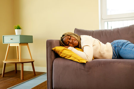 Exhausted Woman Takes Nap On Comfy Couch After Long Day