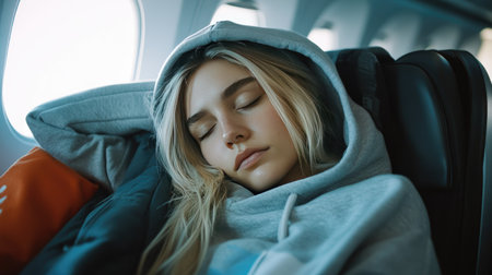 Tired blonde woman in a hoodie leaning her head against the seat, sleeping with her eyes closed on a calm plane ride.