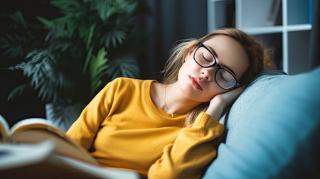 Middle-aged woman in glasses fell asleep while reading book at home, female sleeping sofa near coffee table with houseplant in living room. Sleep deprivation.