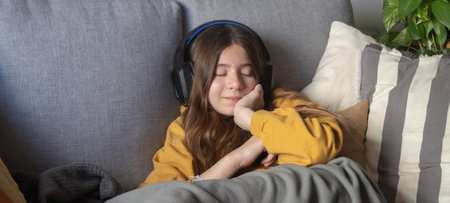 Girl enjoying good quality sound.Happy peaceful female with earphones resting on couch on weekend listening to music. High quality photo. Free lifestyle concept. Copy space