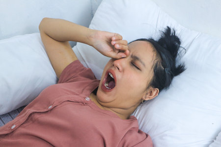 Beautiful young asian woman stretching and yawning in bedroom after wake up in the morning