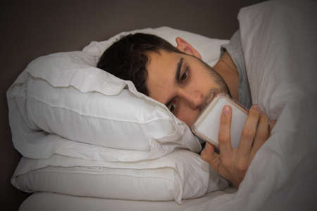 Tired young man with insomnia lying in bed and covered with a white duvet. Hispanic man thinking and feeling stressed while trying to sleep