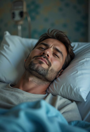 Inside a hospital room, a man lies on a bed, displaying a mix of hope and determination. His expression reflects the fight against illness while surrounded by calming colors and soft linens.