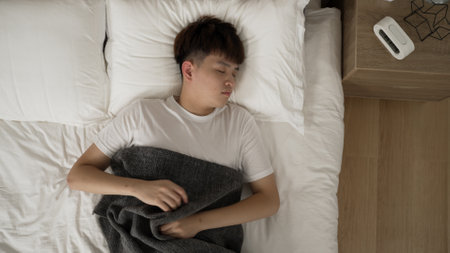 top angle view of an asian man tossing and turning in bed and nearly waking up from sleep in the morning at a modern home bedroom interior.