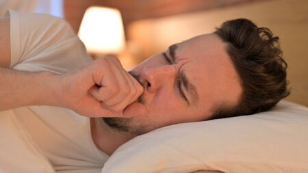 Man lying on white bed, open wide mouth in room alone at apartment.