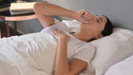 Sick woman is coughing in bed. Light bedroom with white bed linen. virus quarantine. self isolation at home. Morning at home.