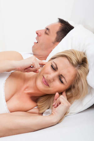 Wife blocking her ears from noise of husband snoring in bedroom at home