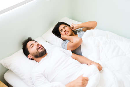 Make it stop. Shot of a young woman struggling to sleep with her boyfriends snoring at home.