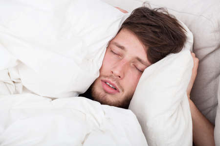 A young man covering his ears with hands while his partner snores loudly next to his in bed
