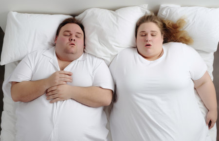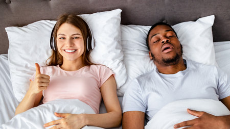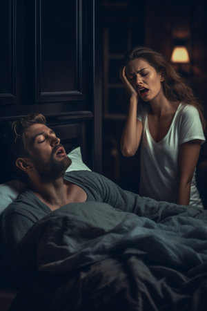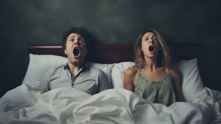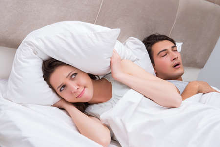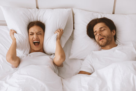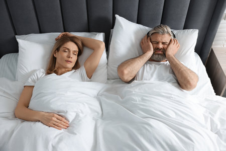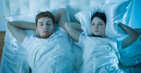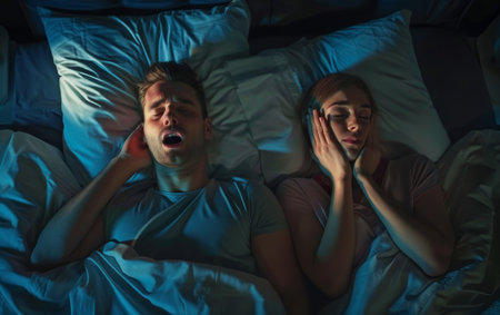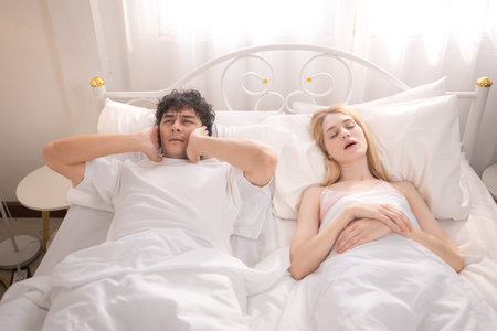 A couple experiences sleep disruption in bed, with the man snoring loudly and the woman covering her ears to block the noise