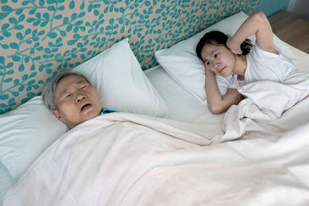 Asian senior grandmother snoring loudly,open mouth,feeling tired exhausted,unhappy child granddaughter covering ears with both hands,annoyed by the snoring of old elderly woman,danger of sleep apnea