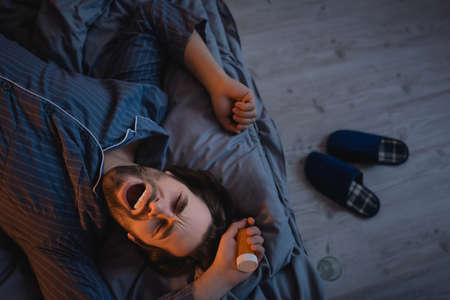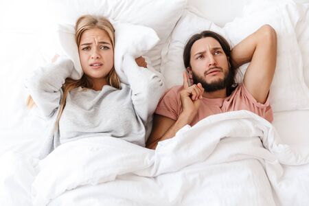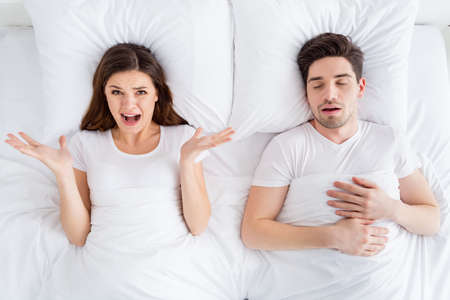 High angle above view photo of crazy lady snoring husband guy couple lying sheets bed covered blanket unpleasant awakening cant sleep yelling suffer wear pajama room indoors