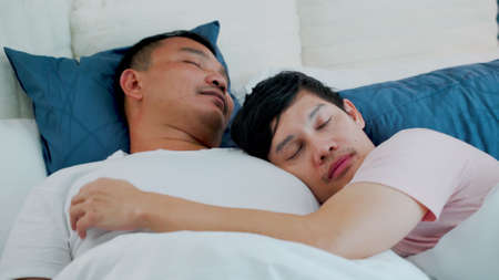 Asian homosexual couple trouble sleeping, because of his lover snores.