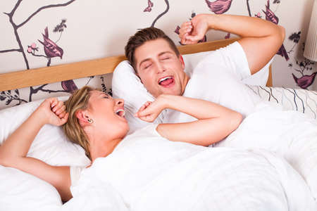 Happy couples relaxing in the white bedroom Of the apartment With various emotions