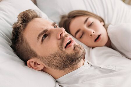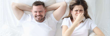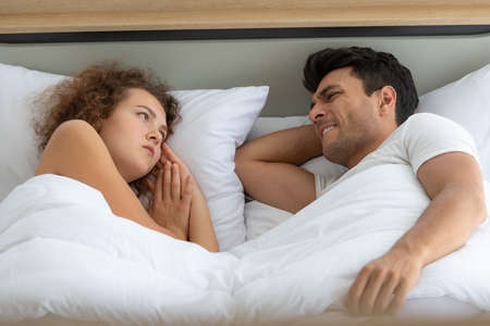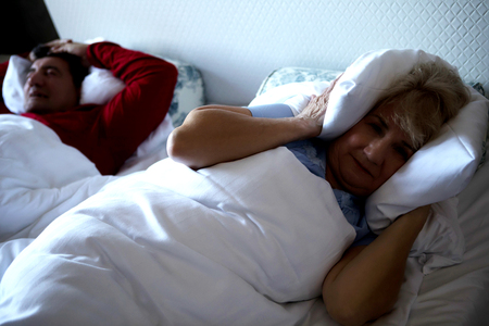 Snoring man in bedroom and wife covering her ears. Husband snoring while the wife suffers and covers her ears. Sleep apnea concept