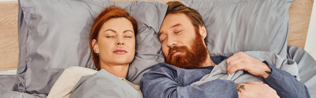 quiet house, parents alone at home, redhead husband and wife sleeping in cozy bedroom, bearded man and carefree woman relaxing on weekends, day off, tattooed, closed eyes, banner