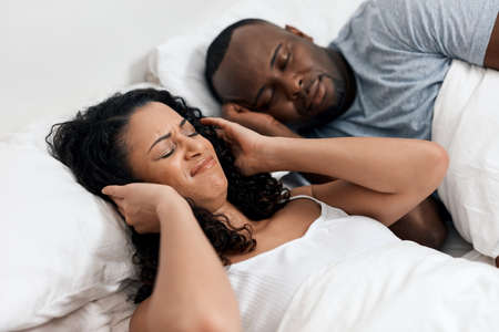 Black woman suffering from her snoring boyfriend, covering ears with palms