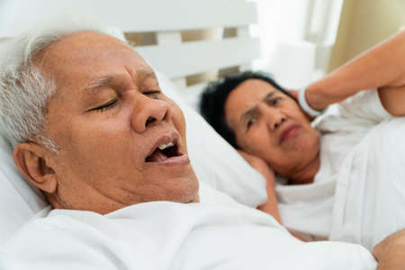 Asian elderly couples Sleeping in bed in the bedroom Men snoring so loudly that women can't sleep. Snoring treatment concept