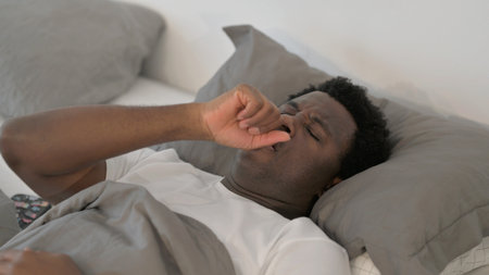 Man lying on white bed, open wide mouth in room alone at apartment.