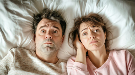 Top view of shocked brunette female overslept work looks unhappily lies next to husband who is glad to spend time with wife in bed Astonished beautiful young woman gets u : Generative AI