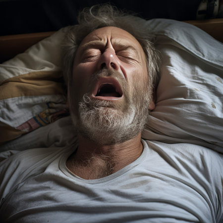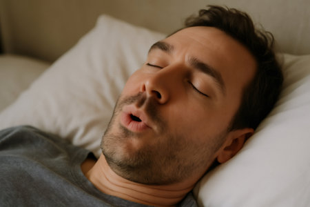 Caucasian man sleeping peacefully in bed, snoring loudly with mouth open, enjoying a restful night and deep relaxation in his bedroom