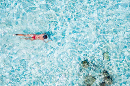 Aerial top view of woman snorkeling from above, girl snorkeler swimming in a clear tropical sea water with corals during summer vacation