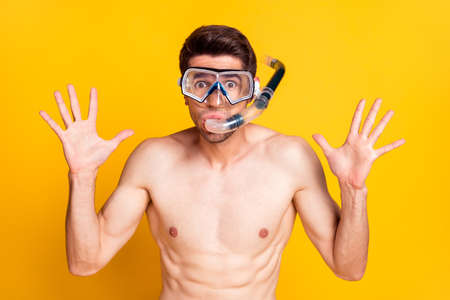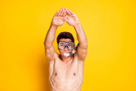 Photo of shocked funky young guy shirtless wear diving mask rising arms isolated yellow color background