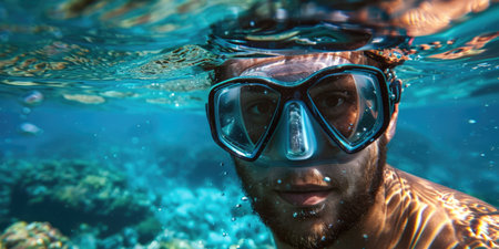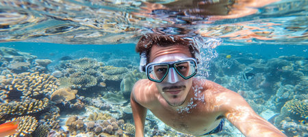 Happy summer vacation. Travel lifestyle, watersport adventure, swim activity on summer beach holiday. handsome man snorkeling underwater. ai generated