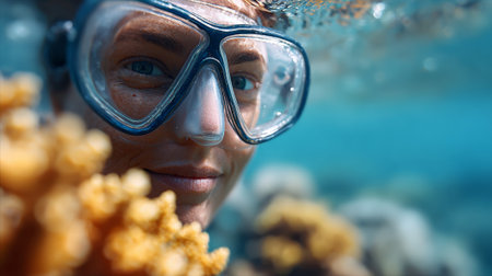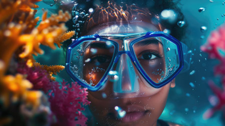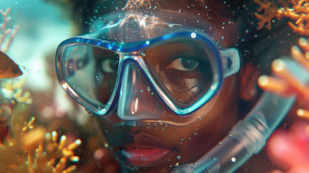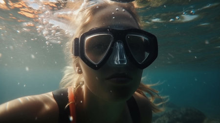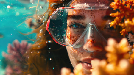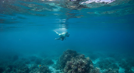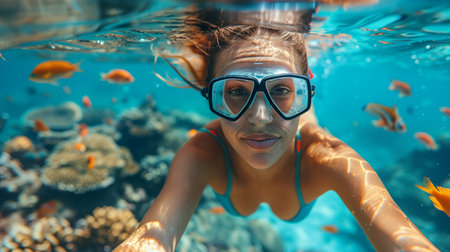 Young woman snorkeling underwater, discovering vibrant coral reefs in a tropical sea while enjoying a summer vacation filled with adventure and the beauty of marine life