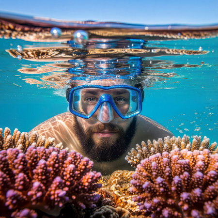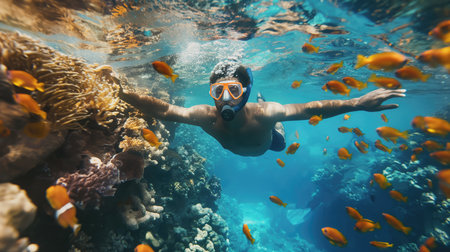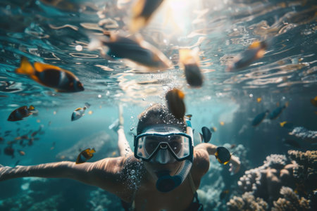 A person is snorkeling underwater, wearing a mask and snorkel. The clear blue water reflects sunlight, creating a vibrant scene filled with aquatic life.