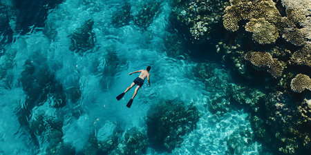 Aerial view of a young man snorkeling in coral reef