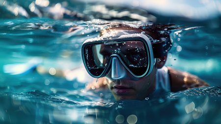 A person with swimming goggles peers above sea level at sunset. perfect for sports and travel themes. A.I.